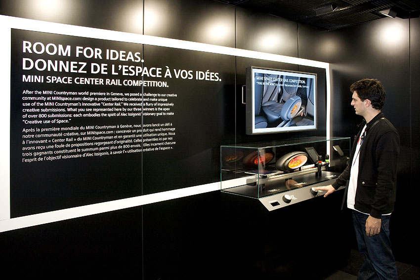 Für die Präsentation des MINI Centerrail Design Contests entwickelte hielscherlungerhausen ein interaktives Präsentationsmöbel, das die realen Designobjekte medial unterstützt. MINI_Paris_Centerrail_00